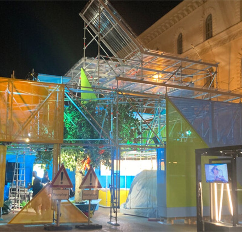 Eine Nummer kleiner Bühne, Messestand mit Leuchtblende, Container